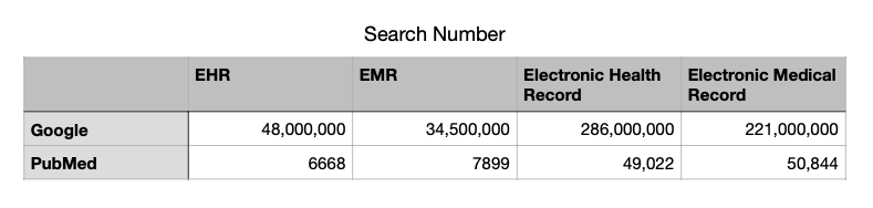 This does appear to be consistent with public use of the term, where EHR and Electronic Health Record consistently beat EMR and Electronic Medical Record respectively. (Interestingly, for the medical search engine PubMed, the reverse appears to be true). See below: