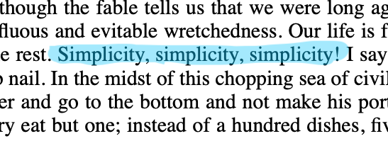 He exclaims the noun simplicity three times, yet quietly mentions the verb simplify twice. (I suspect for a master wordsmith such as Thoreau this is no accident. )