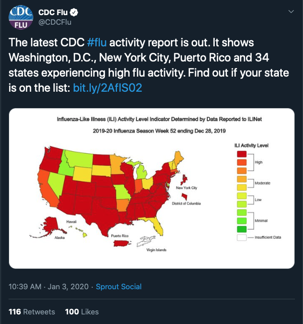 As of the morning of January 7th, the attached @CDCFlu tweet had only been retweeted 116 times, and, by my count, only 16 retweets were done by healthcare organizations, mostly small and local. the rest of the retweets were done by individuals.
