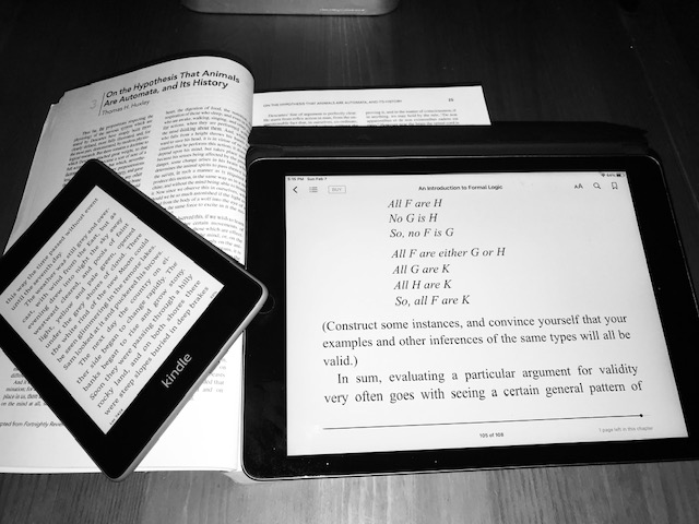 - Physical Books. This is my favorite tool for what I call deep reading—a reading which requires intense thought, and where note creation and highlighting are trivial. I like to physically engage with the books, including bookmarks, sticky notes, and all. These are books I nearly always tend to keep and include subjects ranging from philosophy to medicine. Usually, I am at a desk, with a notepad available to write down secondary notes for future reference.